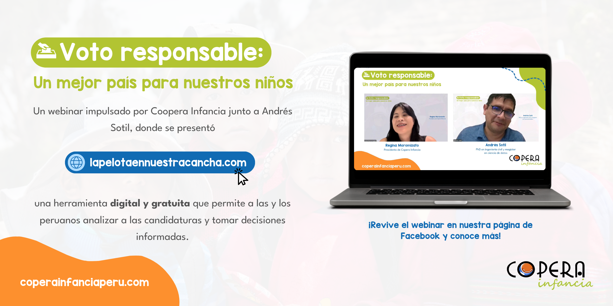 En un contexto electoral decisivo para el futuro del país, Coopera Infancia realizó el webinar “Voto responsable: un mejor país para nuestros niños”, una iniciativa orientada a evaluar la coherencia, trayectoria y responsabilidad de quienes aspiran a gobernar el Perú y que tendrán en sus manos el destino de millones de niñas y niños.